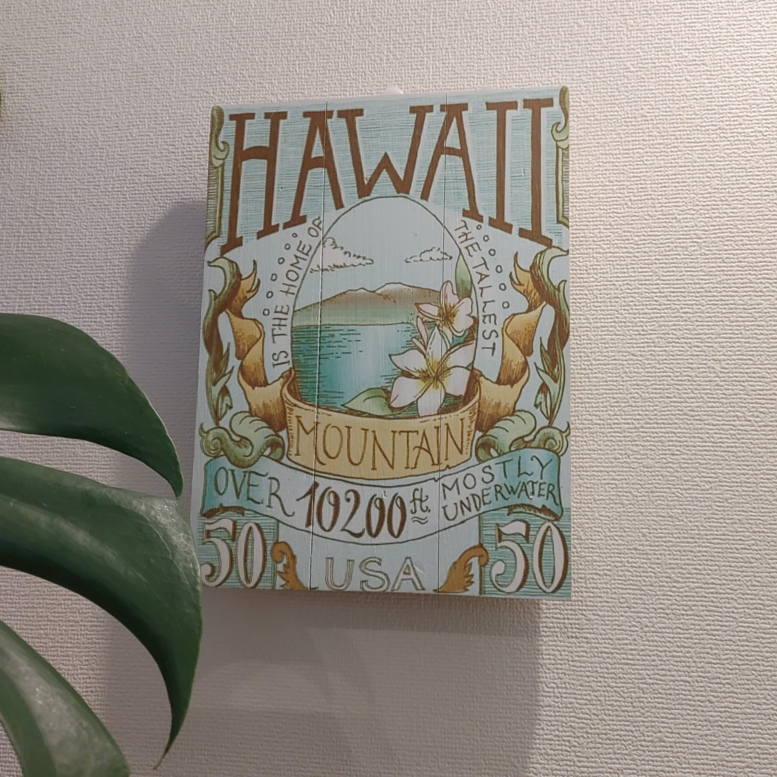 好きな方にはたまらないレトロテイストなハワイアンイラストが描かれた壁掛けアートボード。